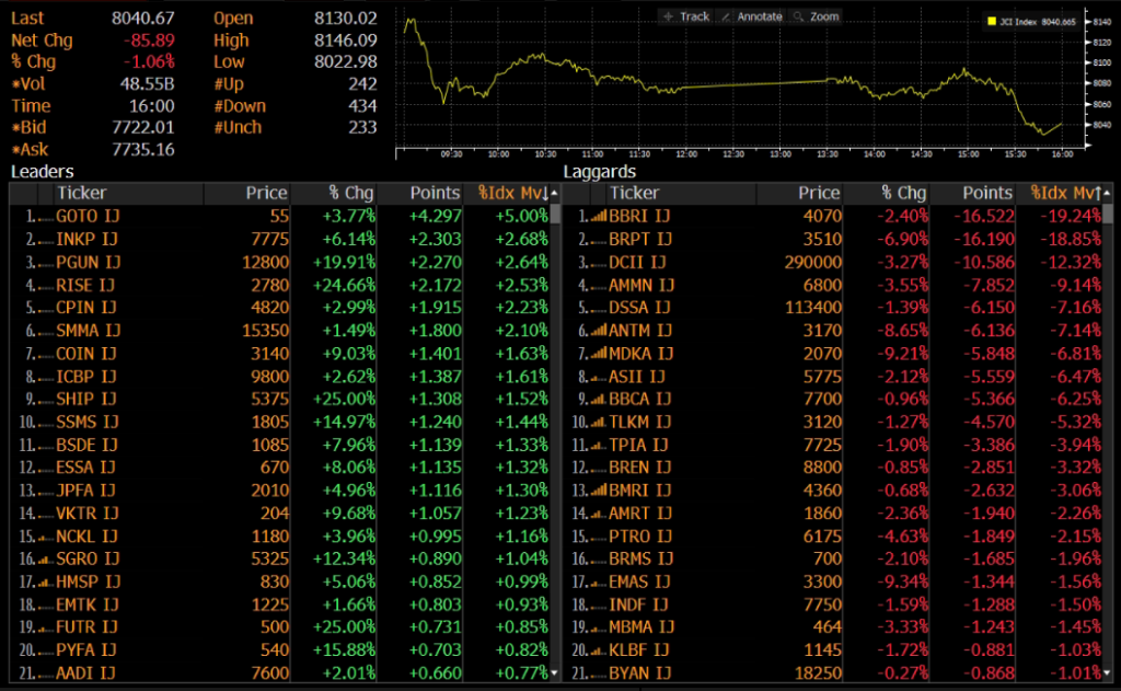 IHSG ditutup melemah 1.06% ke level 8,040 pada perdagangan Kamis (25/09). IHSG tersengat rupiah yang melemah tajam di level Rp16,746 per dollar AS.