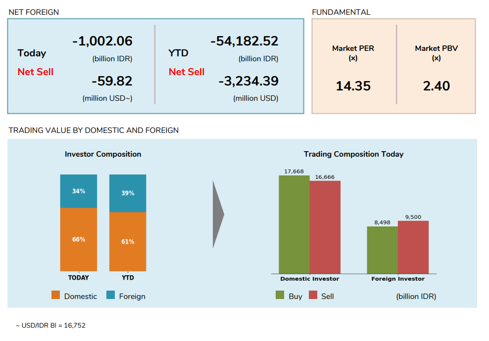 Value transaksi tercatat dengan nilai transaksi sebesar Rp26.25 triliun, lebih rendah dibandingkan hari sebelumnya sebesar Rp38.34 triliun. Sebanyak 434 saham melemah, 242 saham menguat, dan 123 saham stagnan.