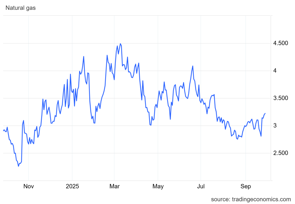 Harga gas alam naik 3% ke level USD3/mmBtu, menandai level tertinggi dalam satu minggu. Kekhawatiran pasokan mendorong kenaikan harga karena produksi di 48 negara bagian di AS turun ke level 107.4 bcfd pada September.