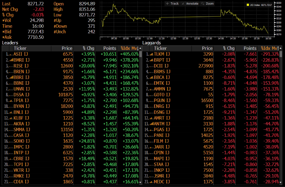 IHSG ditutup melemah tipis 0.03% ke level 8,272 pada Jumat (24/10), meski sempat mencetak rekor tertinggi sepanjang masa di sesi perdagangan. Tekanan jual muncul menjelang akhir pekan setelah aksi profit-taking di sektor teknologi (-2.43%) dan barang baku (-1.30%), sementara sektor properti (+3.09%) dan industrial (+1.34%) masih menopang indeks.
