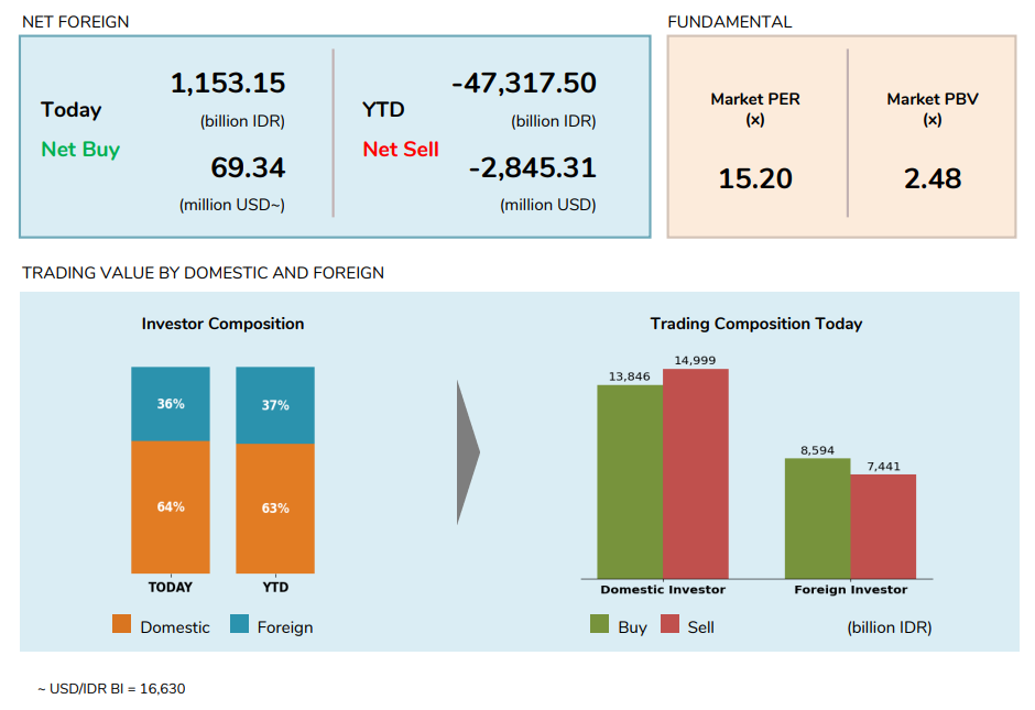 Value transaksi tercatat dengan nilai transaksi sebesar Rp22.46 triliun, lebih tinggi dibandingkan hari sebelumnya sebesar Rp21.06 triliun. Sebanyak 371 saham melemah, 295 saham menguat, dan 143 saham stagnan.