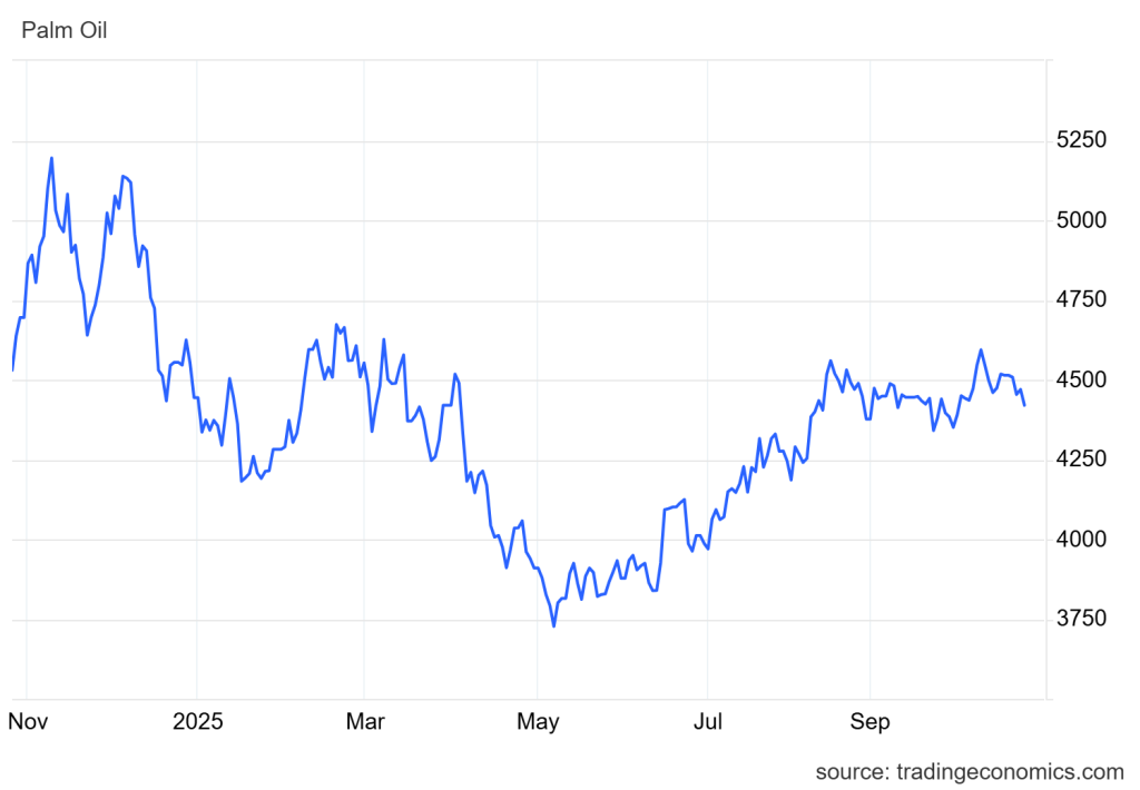 Harga CPO turun 1.1% ke level MYR4,420/ton setelah adanya acara diwali di India. Pelaku pasar khawatir permintaan minyak sawit yang tidak menentu dan cuaca yang tidak dapat diprediksi dapat memengaruhi produksi pada kuartal pertama tahun 2026.