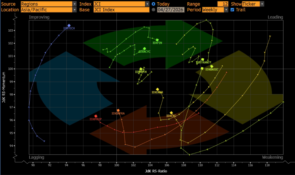 Nikkei menjadi outperformed dan sentuh ke rekor tertinggi baru ditopang reli saham teknologi dan otomasi yang mencatat lonjakan kuat berkat permintaan global. Di sisi lain, pasar Hong Kong cenderung stagnan dan ditutup melemah tipis seiring sikap hati-hati investor terhadap kenaikan harga minyak akibat ketegangan geopolitik US–Iran.
