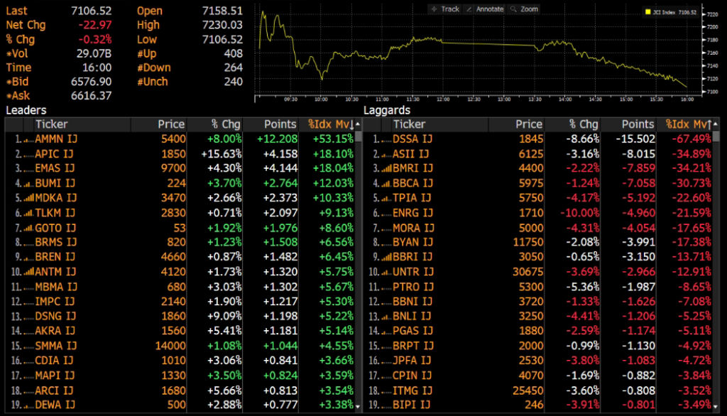 IHSG ditutup melemah 0.32% ke level 7,106 pada perdagangan Senin (27/04). Indeks sempat menguat pada sesi pertama namun berakhir di level terendah. Pelemahan Indeks dibebani oleh saham DSSA, ASII, dan BMRI.
