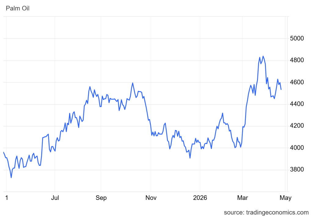 • Harga CPO Malaysia tertahan di bawah MYR 4,600/ton akibat pelemahan soyoil, dan data ekspor 1–25 April turun 15.7% MoM, namun tekanan terbatas oleh kenaikan harga minyak dan potensi pemulihan permintaan India.