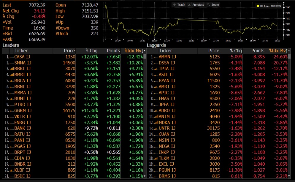IHSG ditutup melemah 0.48% ke level 7,072 pada perdagangan Selasa (28/04). Indeks melemah 7 hari beruntun meskipun di awal sesi sempat rebound terbatas. Pelemahan Indeks dibebani oleh saham AMMN, DSSA, dan TPIA.