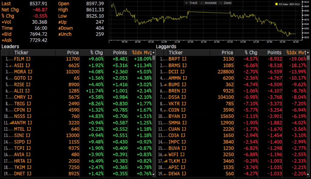 IHSG ditutup turun 0.55% ke level 8,538 pada perdagangan Rabu (24/12). Indeks sempat dibuka di zona hijau ke level 8,611, namun berbalik arah dan konsisten bergerak di zona merah. Penurunan IHSG dibebani oleh saham BRPT, BRMS, dan DCII.