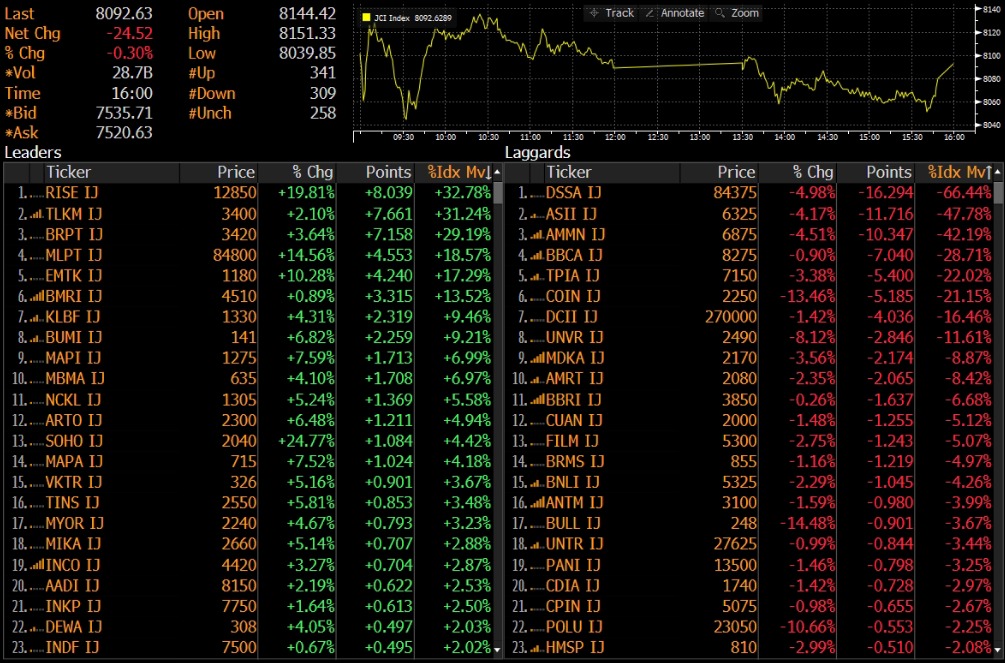 IHSG ditutup melemah 0.30% ke level 8,093 pada perdagangan Selasa (28/10). Indeks dibuka pada zona hijau menyentuh level 8,151 namun kembali koreksi dan ditutup pada zona merah. Sektor ditutup beragam dengan persentase kenaikan terbesar dari sektor property 3.40%, healthcare 2.65%, dan technology 2.28%. Sedangkan untuk penurunan dari sektor industrial 0.99% dan finance 0.74%.