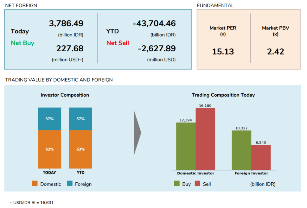 Value transaksi tercatat dengan nilai transaksi sebesar Rp22.75 triliun, lebih tinggi dibandingkan hari sebelumnya sebesar Rp19.83 triliun. Sebanyak 316 saham melemah, 355 saham menguat, dan 140 saham stagnan.