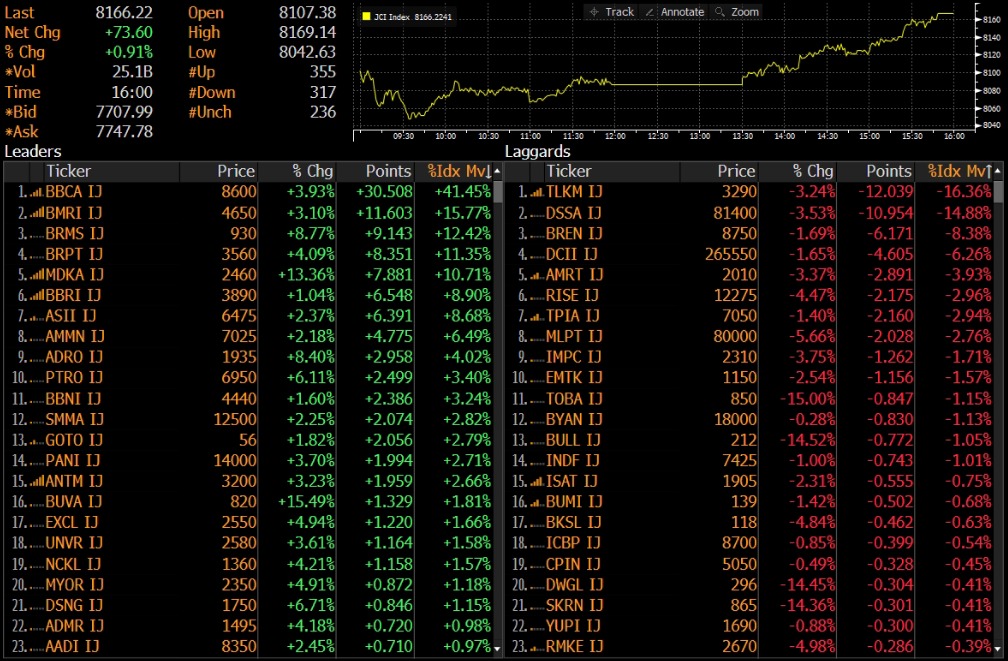 IHSG ditutup menguat 0.910% ke level 8,166 pada perdagangan Rabu (29/10). Indeks berbalik arah dari sesi pertama yang sempat bergerak di zona merah hingga pada sesi kedua berhasil ditutup di level tertinggi. Indeks bergerak beragam dengan penguatan tertinggi dari sektor basic industry (+3.44%) dan koreksi terendah sektor industrial (-0.95%)