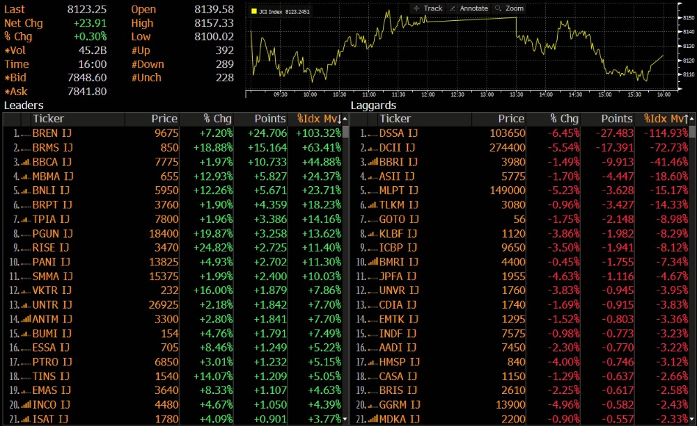 IHSG ditutup menguat 0.30% ke level 8,123 pada perdagangan Senin (29/09). Indeks solid bergerak di zona hijau dengan range pergerakan 8,100-8,157. Mayoritas indeks sektoral mengalami penguatan dengan dipimpin oleh sektor Basic Industri (+4.53%), dan Properti (+2.81%)