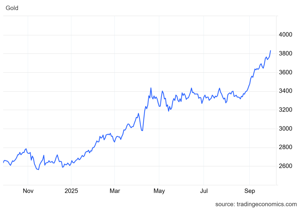 Harga emas naik 2% ke level USD3,833/ons pada Senin, didorong oleh melemahnya dolar dan meningkatnya ekspektasi penurunan suku bunga AS lebih lanjut