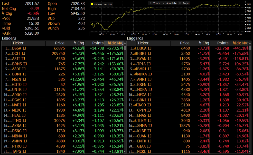 Value transaksi tercatat sebesar Rp14.86 triliun, lebih tinggi dibandingkan hari sebelumnya sebesar Rp11.77 triliun. Sebanyak 403 saham melemah, 272 saham menguat, dan 149 saham stagnan.