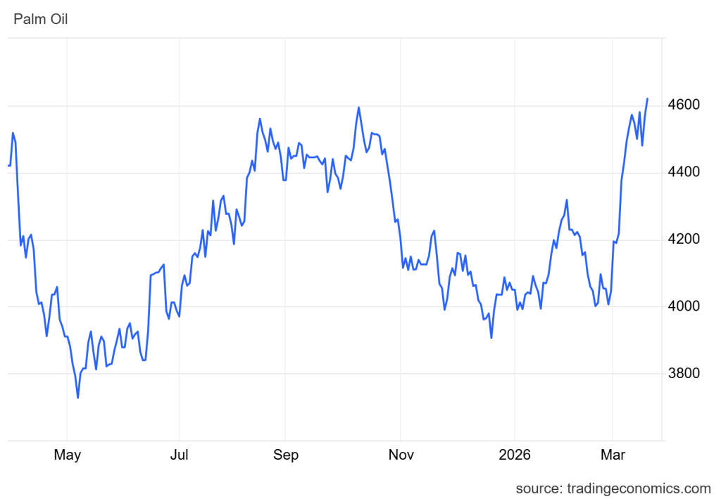 - Harga CPO naik tiga hari berturut-turut di atas MYR 4,650/ton didorong pelemahan ringgit, lonjakan ekspor, serta dukungan harga minyak global di tengah konflik Iran