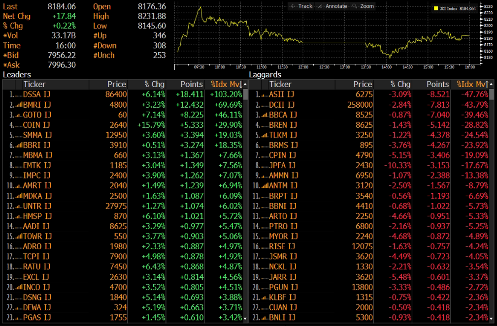 IHSG ditutup menguat tipis 0.22% ke level 8,184 pada perdagangan Kamis (30/10). Indeks cenderung wait and see di tengah penantian pasar menunggu kesimpulan lengkap dari kesepakatan pertemuan Presiden Amerika Serikat (AS) Donald Trump dan Presiden China Xi Jinping.