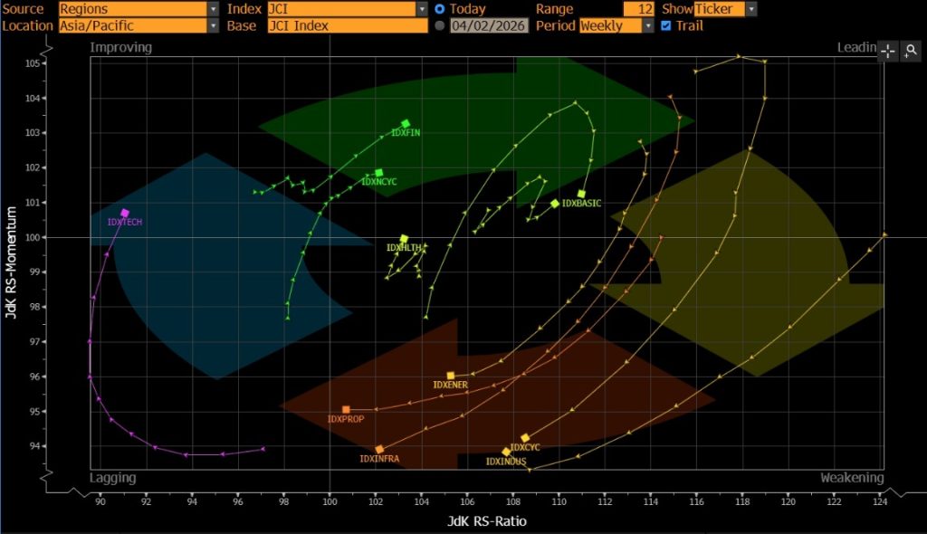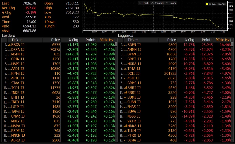 IHSG ditutup melemah 2.19% ke level 7,026 pada perdagangan Kamis (02/04). Indeks melemah seiring tekanan dari sentimen global setelah pernyataan Donald Trump yang membuka peluang eskalasi lanjutan. Pelemahan IHSG dibebani oleh saham BREN, AMMN, dan BYAN.
