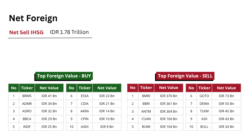 Value transaksi tercatat sebesar Rp13.49 triliun, lebih rendah dibandingkan hari sebelumnya sebesar Rp15.25 triliun. Sebanyak 407 saham melemah, 250 saham menguat, dan 158 saham stagnan.