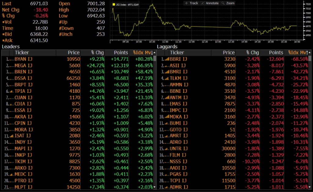 IHSG ditutup turun 0.26% ke level 6,971 pada perdagangan Selasa (07/04). Pergerakan indeks cenderung volatile, sempat ke level tertinggi 7,022 dan juga sempat menyentuh level terendah 6,943. Pelemahan IHSG dibebani oleh saham BBRI, ASII, dan BMRI.