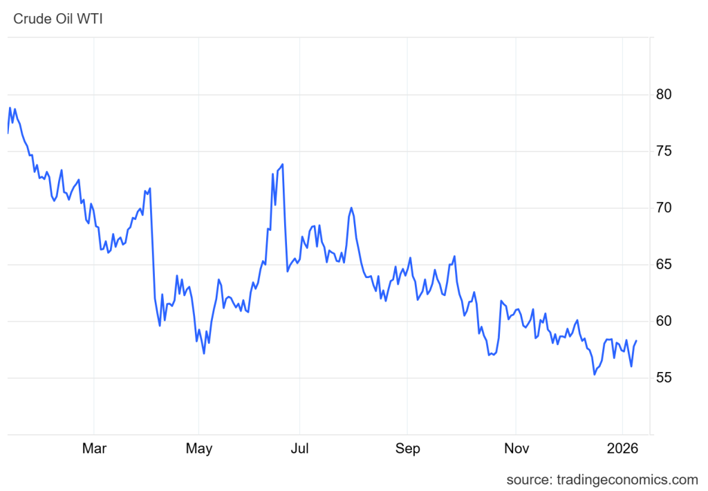 Harga minyak WTI naik 3% ke level USD58/barel pada Kamis, rebound dari penurunan hari sebelumnya, masih didorong oleh tensi geopolitik AS-Venezuela.