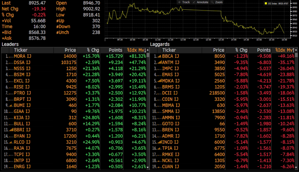 IHSG ditutup turun 0.22% ke level 8,925 pada perdagangan Kamis (08/01). Indeks bergerak volatil dan sempat sentuh ATH di level 9,000. Pelemahan IHSG dibebani oleh saham BBCA, ANTM, dan IMPC.